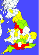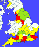 distribution map for the year 1881, the BRYER variant was most prevalent in Middlesex/London (84), with the next highest concentrations in Lancashire (45), Kent (43), Somerset (41), Hampshire (34), and Derbyshire (21). Click on the left-hand thumbnail to see a full size version of the map. The right-hand thumbnail shows a map of where the people of 1881
